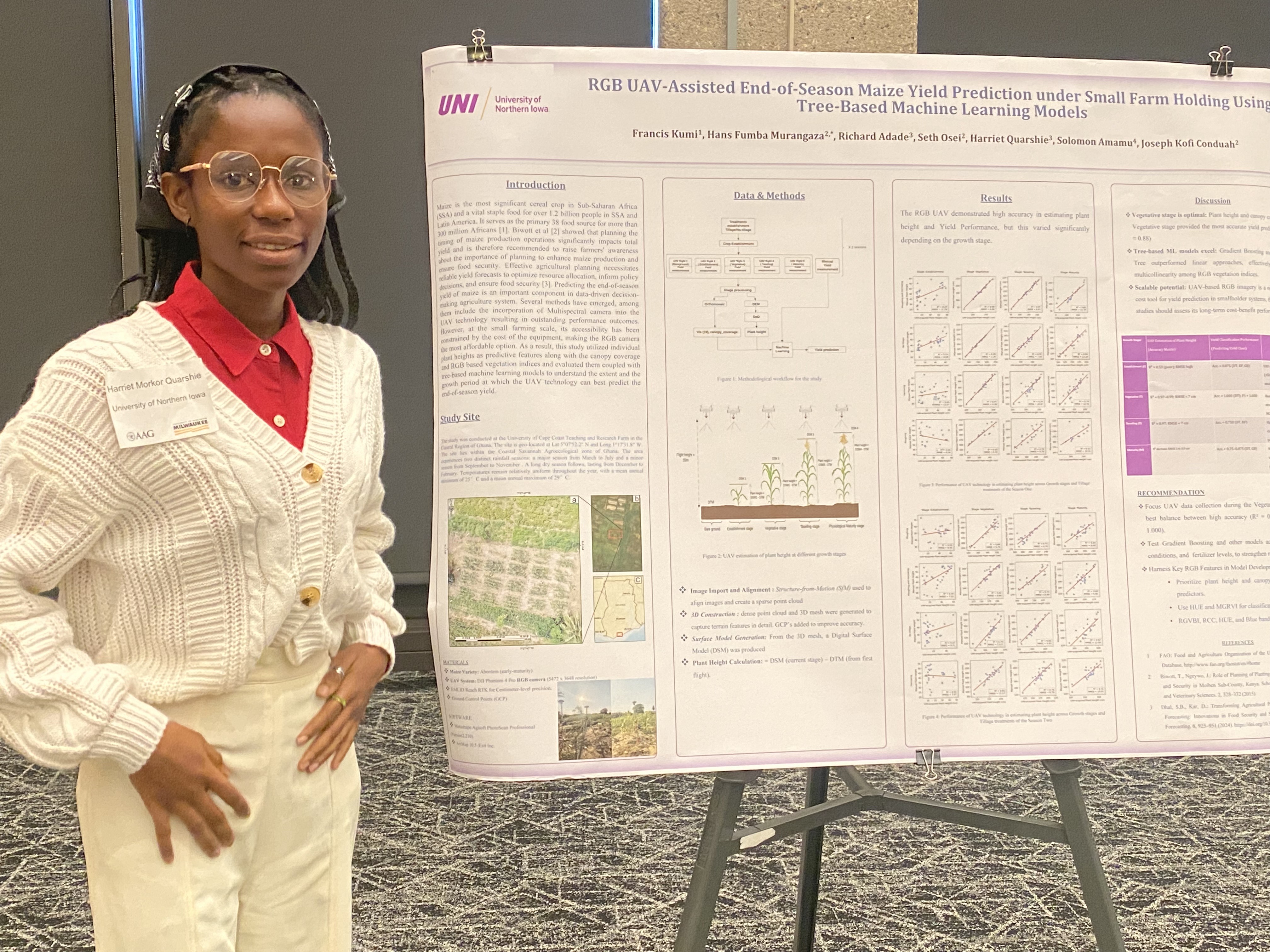 - Harriet Quarshie won 2nd Place Poster Presentation for her study RGB UAV-Assisted End-of-Season Maize Yield Prediction Under Small Farm Holding Using Tree-Based Machine Learning Models. She remarked: “The recognition of my poster was deeply encouraging, motivating me to continue refining my methods and exploring applications of machine learning in agriculture.”